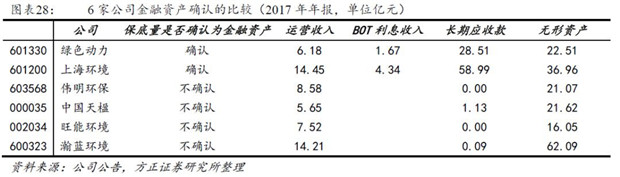6家上市公司中,綠色動(dòng)力、上海環(huán)境將保底垃圾處置費(fèi)確認(rèn)為金融資產(chǎn)-長(zhǎng)期應(yīng)收款,建設(shè)投資剩余部分確認(rèn)為無形資產(chǎn)-特許經(jīng)營(yíng)權(quán);而偉明環(huán)保、中國(guó)天楹、旺能環(huán)境、瀚藍(lán)環(huán)境將全部建設(shè)投資轉(zhuǎn)入無形資產(chǎn)。