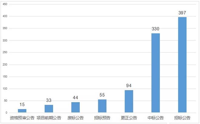11月上旬(11月1日-10日)全國各地共發(fā)布環(huán)衛(wèi)運(yùn)營類項(xiàng)目公開招標(biāo)采購信息968個,其中:項(xiàng)目前期公告33個,招標(biāo)預(yù)告55個,招標(biāo)公告397個,資格預(yù)審公告15個,更正公告94個,中標(biāo)公告330個,廢標(biāo)及流標(biāo)公告44個。