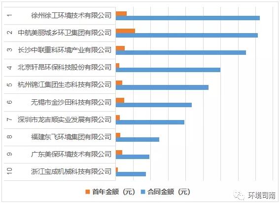 其中:“徐州徐工環(huán)境技術(shù)有限公司、中航美麗城鄉(xiāng)環(huán)衛(wèi)集團(tuán)有限公司、長沙中聯(lián)重科環(huán)境產(chǎn)業(yè)有限公司、杭州錦江集團(tuán)生態(tài)科技有限公司、深圳市龍吉順實(shí)業(yè)發(fā)展有限公司”等10家公司共中標(biāo)17個項(xiàng)目,合同總金額49.53億元,中標(biāo)項(xiàng)目首年服務(wù)費(fèi)總金額4.34億元。