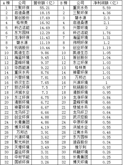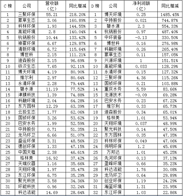 2017年多數(shù)環(huán)保上市企業(yè)一季度報(bào)告顯示贏得開門紅,同期均有所增長(zhǎng),僅四家表示營(yíng)業(yè)收入同期下降。不過(guò)凈利潤(rùn)7家為虧損狀態(tài), 15家同期下降。以下A榜為營(yíng)業(yè)收入排行榜,B榜為凈利潤(rùn)排行榜。C榜為營(yíng)業(yè)收入同比增長(zhǎng)率排行榜,D榜為凈利潤(rùn)同比增長(zhǎng)率排行榜。