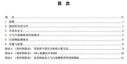 本標準規(guī)定了家具制造業(yè)各排放環(huán)節(jié)大氣污染物控制指標,各指標排放限值及對應監(jiān)測方法,相關監(jiān)督管理要求。上述企業(yè)排放水污染物、環(huán)境噪聲以及其他工藝流程的大氣污染物適用相應的國家或地方污染物排放標準,產生固體廢物的鑒別、處理和處置適用相應的國家或地方固體廢物污染控制標準。