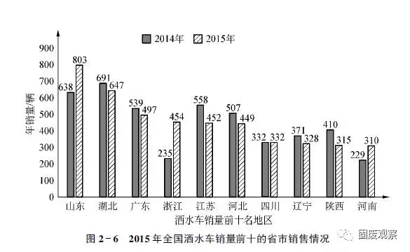 2015年,我國灑水車銷量前十名的地區(qū)有山東、湖北、廣東、浙江、江蘇、河北、四川、遼寧、陜西、河南。其中,山東省銷售超過800輛,同比增長超過25%,在2015年全國灑水車總銷量(下同)中的占有份額超過10%,同比提升2.73%;湖北、廣東、浙江、江蘇、河北分列全國灑水車分省銷量第2~6位,累計銷量均在400輛以上,占有份額分別達(dá)到8.41%、6.46%、5.90%、5.88%的5.84%。累計銷量同比,湖北和廣東分別遭遇到6%和7%以上的下降,江蘇和河北分別下降19%和11%以上。