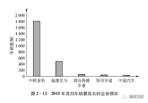 2015年我國洗掃車市場累計銷量前5企業(yè)合計銷售洗掃車2448輛,在2015年全國洗掃車總銷量(下同)中的占有份額合計實現(xiàn)90.67%。其中,中聯(lián)重科累計實現(xiàn)銷量1820輛,是2015年全國銷售洗掃車企業(yè)中唯一一家洗掃車?yán)塾嬩N量超過1000輛且在1800輛以上的企業(yè),同比增長在47%以上,占有份額超過67%,同比下降4.10%,高居全國洗掃車行業(yè)榜首;福建龍馬環(huán)衛(wèi)以累計銷量491輛,18%以上的占有份額屈居第二(詳見表2-12),其余企業(yè)累計銷量均在70輛以下。
