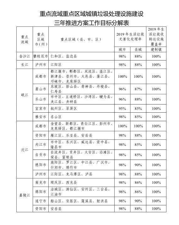 2017年4月,省政府辦公廳印發(fā)了《四川省城鎮(zhèn)污水處理設(shè)施建設(shè)三年推進方案》和《四川省城鄉(xiāng)垃圾處理設(shè)施建設(shè)三年推進方案》(川辦函〔2017〕85號,以下簡稱兩個三年推進方案),各地按照兩個三年推進方案,積極推進城鎮(zhèn)污水和城鄉(xiāng)垃圾處理設(shè)施建設(shè),取得了積極成效。為加快推進四川省城鎮(zhèn)污水和城鄉(xiāng)垃圾處理設(shè)施建設(shè),切實改善城鄉(xiāng)生態(tài)環(huán)境質(zhì)量,更好滿足人民群眾對美好環(huán)境的需求,省政府組織住房城鄉(xiāng)建設(shè)廳對兩個三年推進方案作了修訂完善。經(jīng)省政府同意,現(xiàn)將修訂后的兩個三年推進方案主要建設(shè)任務(wù)表、目標(biāo)任務(wù)表、重點流域重點區(qū)域目標(biāo)分解表及實施項目計劃表印發(fā)你們,并就有關(guān)事項通知如下。