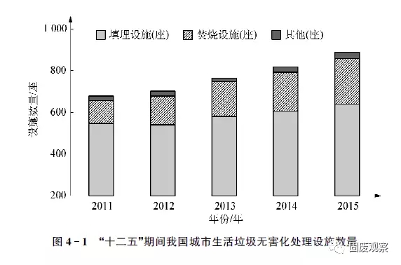 (1)填埋設(shè)施和處理量總體增長(zhǎng),總量占比有所下降