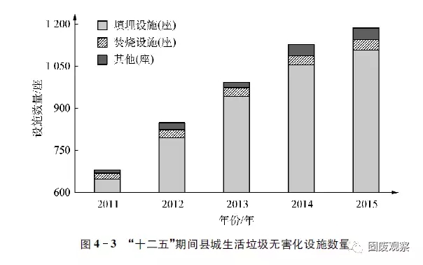 2015年全國(guó)縣級(jí)行政區(qū)域的無害化處理廠1187座,其中填埋設(shè)施1108座,比2014年新增53座,占全部縣級(jí)無害化處理設(shè)施的93.3%,從圖4-3可知,“十二五”期間縣城生活垃圾無害化處理設(shè)施建設(shè)得到快速發(fā)展。