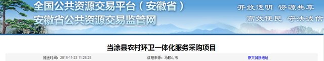 2018年11月23日,安徽省馬鞍山市當涂縣農(nóng)村環(huán)衛(wèi)一體化服務采購項目發(fā)布招標公告。