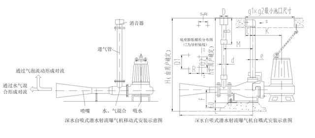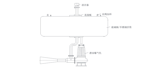 FQXB潛水浮動(dòng)式曝氣機(jī)由浮筒、暗轉(zhuǎn)支架、潛水電機(jī)、混合室、底座、進(jìn)氣管和消音器組成。與NQXB潛水離心曝氣機(jī)其主機(jī)結(jié)構(gòu)、性能參數(shù)、外形尺寸完全相同。選型按NQXB系列確定