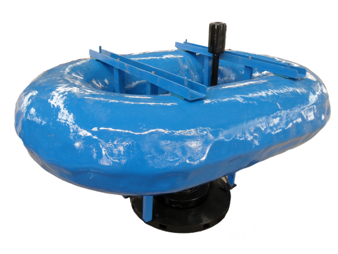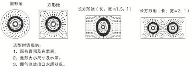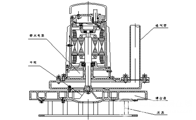 進(jìn)氣管上端為空氣吸入口,位于水面之上,下端與混合室聯(lián)通,接通電源后由于葉輪旋轉(zhuǎn),高速水流從葉輪出口流出,經(jīng)混合室形成負(fù)壓,因而空氣被吸入并與污水混合,混合液從出口流出,完成對(duì)污水的充氧。