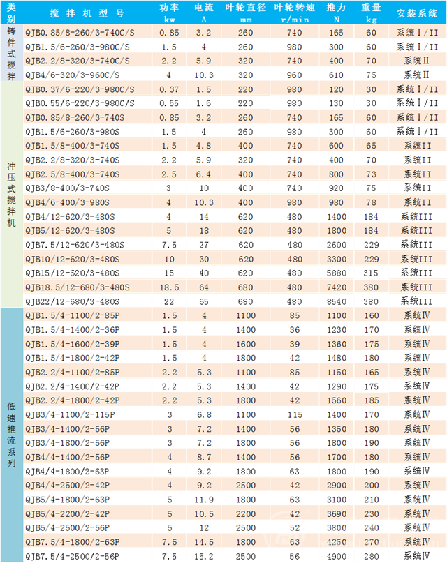 QJB型潛水?dāng)嚢铏C可分為混合攪拌和低速推流兩大系列。