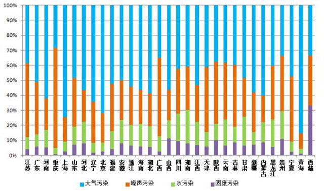 從各省污染類型占比來看,北京、上海、青海的大氣污染舉報(bào)占比超過七成,比全國(guó)平均水平高出10個(gè)百分點(diǎn);重慶、廣西噪聲污染占比超過五成,高出全國(guó)平均水平15個(gè)百分點(diǎn),夜間施工噪聲擾民問題突出。