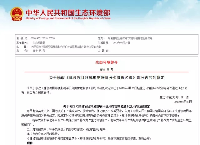 生態(tài)環(huán)境部2018年第3次部務(wù)會(huì)審議并通過了《關(guān)于修改<建設(shè)項(xiàng)目環(huán)境影響評價(jià)分類管理名錄>部分內(nèi)容的決定》,對《建設(shè)項(xiàng)目環(huán)境影響評價(jià)分類管理名錄》(環(huán)境保護(hù)部令第44號)的部分內(nèi)容予以修改,并于公布之日起實(shí)施。來源:生態(tài)環(huán)境部修改《建設(shè)項(xiàng)目環(huán)境影響評價(jià)分類管理名錄》,是落實(shí)習(xí)近平總書記重...