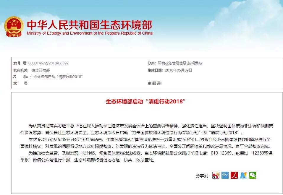 為遏制長江流域固體廢物非法轉(zhuǎn)移傾倒案件多發(fā)態(tài)勢,及時(shí)消除環(huán)境安全隱患,保障長江生態(tài)環(huán)境安全,生態(tài)環(huán)境部決定組織開展打擊固體廢物環(huán)境違法行為專項(xiàng)行動(dòng)。從有關(guān)?。▍^(qū)、市)環(huán)保系統(tǒng)抽調(diào)人員,組成150個(gè)專項(xiàng)行動(dòng)督查組,對長江經(jīng)濟(jì)帶11省(市)1400多個(gè)固體廢物堆存點(diǎn)位進(jìn)行現(xiàn)場核查督導(dǎo)。這場名為“清廢行動(dòng)...
