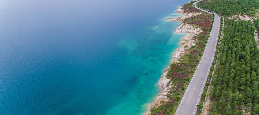 在位于廣東茂名市區(qū)西北角的露天礦,60多歲的退休市民陳阿姨站在一座歐式小木屋下乘涼。眼前是一片寬闊清澈的湖水,湖的兩岸樹木蔥蘢、綠草茵茵。而在四年前,這里還是一個被廢棄的油頁巖大礦坑,垃圾遍地、污水橫流,被當?shù)厝送葱牡胤Q為這座城市的“傷疤”。這是茂名露天礦生態(tài)公園中的湖邊公路(8月17日攝)。上圖:...