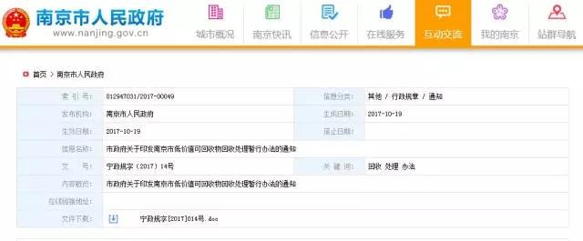 10月19日,南京市政府公布了《南京市低價值可回收物回收處理暫行辦法》,根據(jù)辦法規(guī)定,城市管理部門負責管理轄區(qū)內(nèi)低價值可回收物回收工作,并通過政府采購方式向企業(yè)購買低價值可回收物的回收、處理服務。辦法自今年11月20日起施行,有效期3年。 《辦法》公布后,南京成為繼廣州之后,又一個出臺有關低值可回收...
