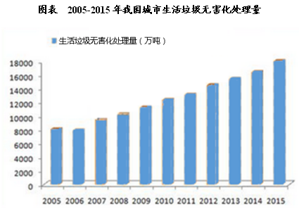 中投顧問發(fā)布的《2017-2021年中國處理行業(yè)深度調(diào)研及投資前景預測報告》數(shù)據(jù)顯示:2015年,全國城市生活垃圾清運量為19142.17萬噸(約1.91億噸),處理量為18750.64萬噸(約1.88億噸),城市生活率97.95%。截至2015年,共建設處理廠(場)890座,其中填埋場640座,焚...