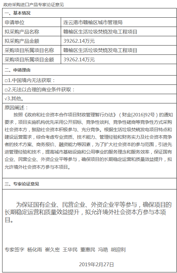 日前江蘇政府采購(gòu)網(wǎng)發(fā)布了《贛榆區(qū)生活垃圾焚燒發(fā)電工程PPP項(xiàng)目境外社會(huì)資本采購(gòu)專家論證》,論證意見為,按照《政府和社會(huì)資本合作項(xiàng)目財(cái)政管理暫行辦法》(財(cái)金[2016]92號(hào))的通知要求,項(xiàng)目實(shí)施機(jī)構(gòu)優(yōu)先采用公開招標(biāo)、競(jìng)爭(zhēng)性談判、競(jìng)爭(zhēng)性磋商等競(jìng)爭(zhēng)性方式采購(gòu)社會(huì)資本方,鼓勵(lì)社會(huì)資本積極參與、充分競(jìng)爭(zhēng)。根...