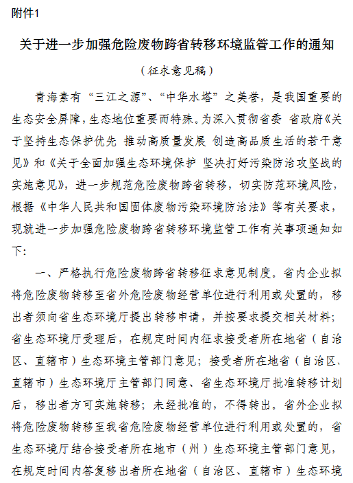 關(guān)于征求《關(guān)于進(jìn)一步加強(qiáng)危險(xiǎn)廢物跨省轉(zhuǎn)移環(huán)境監(jiān)管工作的通知(征求意見稿)》意見建議的函各市(州)生態(tài)環(huán)境局,省固體廢物污染防治中心、省環(huán)境保護(hù)綜合行政執(zhí)法監(jiān)督局,相關(guān)危險(xiǎn)廢物產(chǎn)生、經(jīng)營(yíng)單位:為強(qiáng)化危險(xiǎn)廢物跨省轉(zhuǎn)移環(huán)境監(jiān)管,切實(shí)防范環(huán)境風(fēng)險(xiǎn),青海省生態(tài)環(huán)境廳草擬了《關(guān)于進(jìn)一步加強(qiáng)危險(xiǎn)廢物跨省轉(zhuǎn)移環(huán)境監(jiān)...