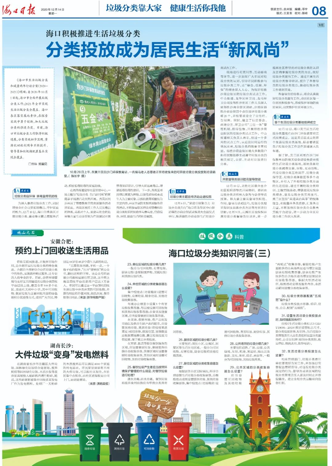 文章導(dǎo)讀《海口市生活垃圾分類和減量兩年行動方案(2020-2021)》明確:自2020年10月1日起,海口市全面開展垃圾分類工作;2021年全市實現(xiàn)生活垃圾分類全覆蓋。??诟鲄^(qū)落實屬地責(zé)任,在探索實踐中勇于創(chuàng)新,加大垃圾分類的推進力度。目前,??谑欣诸惞ぷ魅〉梅e極進展,分類實效初步顯現(xiàn)、資源化回...