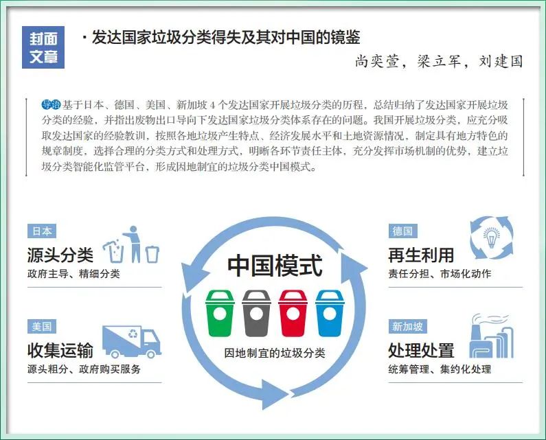 本文亮點(diǎn)在綜述了發(fā)達(dá)國家垃圾分類開展進(jìn)程的基礎(chǔ)上,分析了不同國家選擇不同分類方式和處理方式的原因,指出了廢物出口導(dǎo)向下發(fā)達(dá)國家垃圾分類體系存在的問題,進(jìn)而總結(jié)了我國需要吸取的經(jīng)驗(yàn)教訓(xùn),為我國開展垃圾分類提出了建議。內(nèi)容簡介及結(jié)論近年來,我國不斷推進(jìn)垃圾分類工作的深入開展,46個(gè)重點(diǎn)城市已逐步建成垃圾...