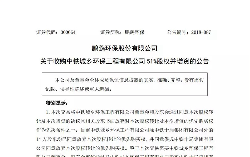 11月19日,鵬鷂環(huán)保股份有限公司開(kāi)了第二屆董事會(huì)第十八次會(huì)議,審議通過(guò)了《關(guān)于收購(gòu)中鐵城鄉(xiāng)環(huán)保工程有限公司51%股權(quán)并增資的議案》,同意公司收購(gòu)中鐵城鄉(xiāng)環(huán)保工程有限公司(以下簡(jiǎn)稱“中鐵環(huán)保”或“標(biāo)的公司”)51%股權(quán)并對(duì)其進(jìn)行增資,其中股權(quán)轉(zhuǎn)讓價(jià)款4...