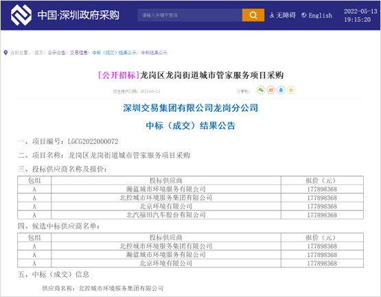 兩標20億元,北控城市服務“城市大管家”之路越走越寬廣。深圳政府采購網(wǎng)消息,2022年5月13日,深圳市龍崗區(qū)平湖街道城市管家服務項目公布中標結果,在與北京環(huán)境有限公司、瀚藍城市環(huán)境服務有限公司、北汽福田汽車股份有限公司的同場較量中,北控城市環(huán)境服務集團有限公司成功勝出。成交信息如下:供應商名稱:北...