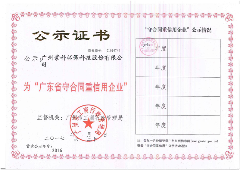 近日,順利通過省工商行政管理局評(píng)審,獲得2016年度廣東省“守合同重信用企業(yè)”,此舉肯定了紫科環(huán)保誠信守約經(jīng)營、信用文化建設(shè)與良好的客戶口碑?!皬V東省守合同重信用企業(yè)”獲評(píng)企業(yè),均為有實(shí)力的誠信標(biāo)桿企業(yè)。它是由廣東省工商行政管理局評(píng)定頒發(fā)的,用于鼓勵(lì)企業(yè)加強(qiáng)合同和信用管理,促進(jìn)當(dāng)?shù)仄髽I(yè)信用體系建設(shè)。...