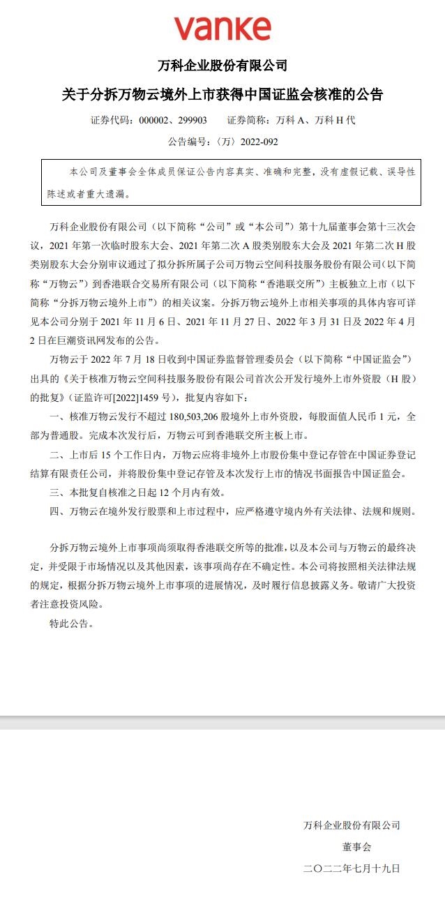 2022年7月18日晚間,萬科發(fā)布公告稱,分拆子公司萬物云空間科技服務(wù)股份有限公司到香港聯(lián)交所主板上市一事已獲中國證監(jiān)會核準(zhǔn)。 核準(zhǔn)萬物云發(fā)行不超過 180,503,206 股境外上市外資股,每股面值人民幣 1 元,全 部為普通股。完成本次發(fā)行后,萬物云可到香港聯(lián)交所主板上市。 據(jù)悉,萬物云一般經(jīng)營...