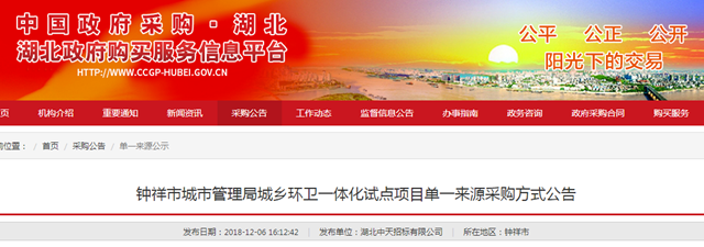 2018年12月6日,湖北省鐘祥市城鄉(xiāng)環(huán)衛(wèi)一體化試點項目發(fā)布單一來源采購方式公告,擬選擇單一來源供應商為中國光大生態(tài)資源(香港)有限公司,項目預算2262萬/年。 據(jù)悉,項目的服務范圍以鐘祥市所轄的5個鄉(xiāng)鎮(zhèn)為試點(包括:舊口鎮(zhèn)、柴湖鎮(zhèn)、長灘鎮(zhèn)、九里鄉(xiāng)、東橋鎮(zhèn))共計147個行政村,主要內容包括農村鎮(zhèn)區(qū)...
