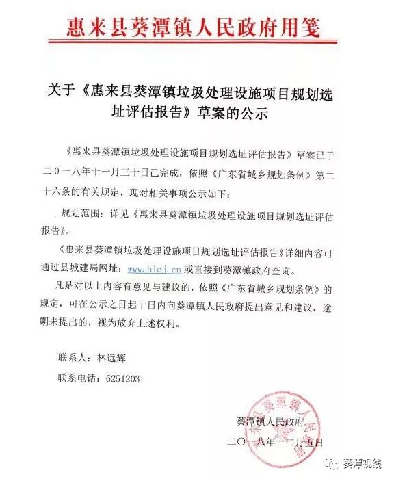 日前廣東揭陽惠來縣葵潭鎮(zhèn)政府發(fā)布了關于《惠來縣葵潭鎮(zhèn)垃圾處理設施項目規(guī)劃選址評估報告》草案的公示,具體內容如下:原標題:關于《惠來縣葵潭鎮(zhèn)垃圾處理設施項目規(guī)劃選址評估報告》草案的公示
